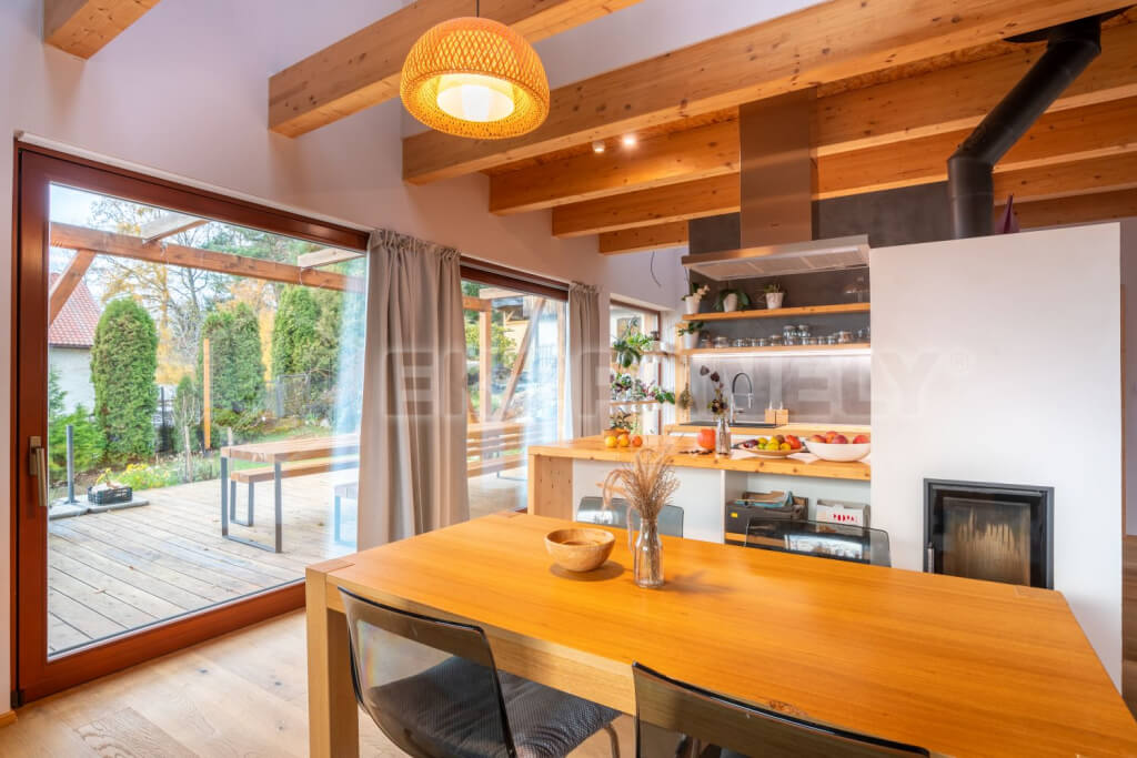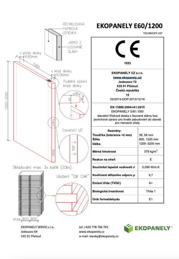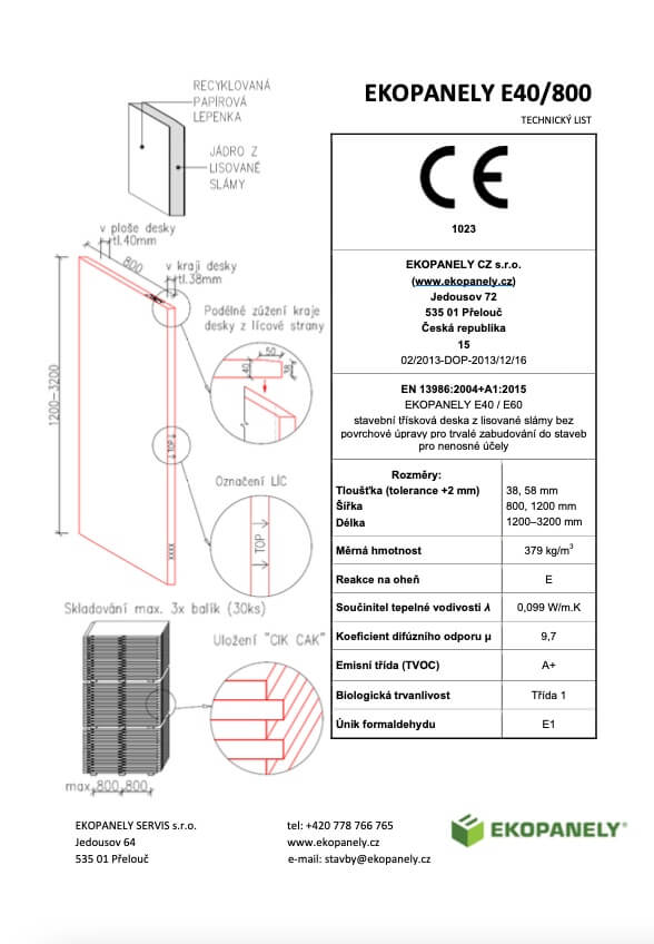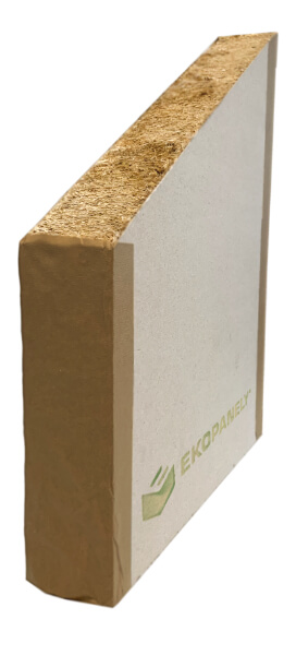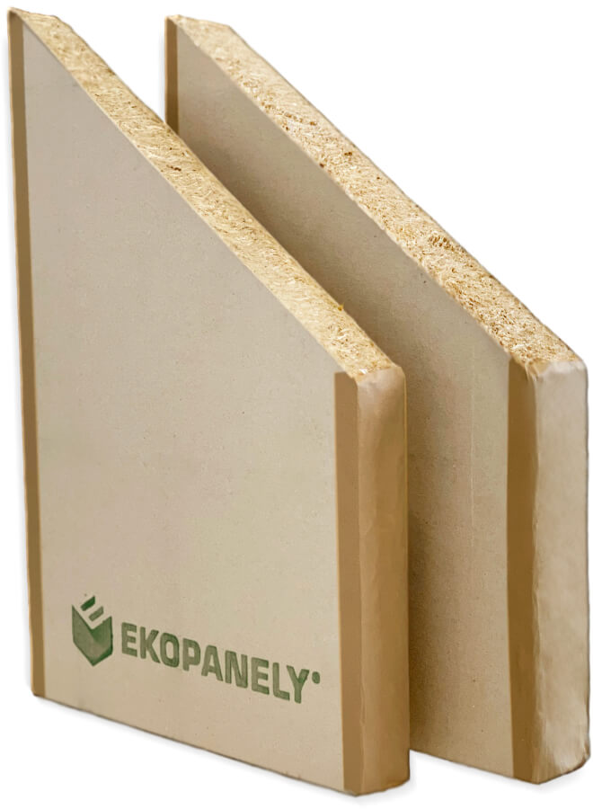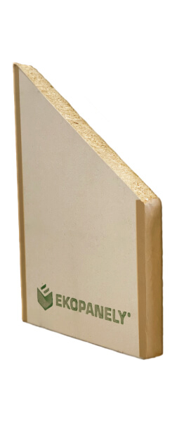 The Ekopanely board is the eco-friendly building material of the future. It can be used as a substitute for bricks, drywall, or particleboard. It is used for interior cladding of wooden structures, partitions, built-ins, ceilings, or as cladding. Thanks to the high density of its compressed core, Ekopanely boards are practically non-flammable. Ekopanely boards are produced in two thicknesses: 58 mm with a width of 1200 mm and 38 mm with a width of 800 mm. The average density is 379 kg/mΒ³.
